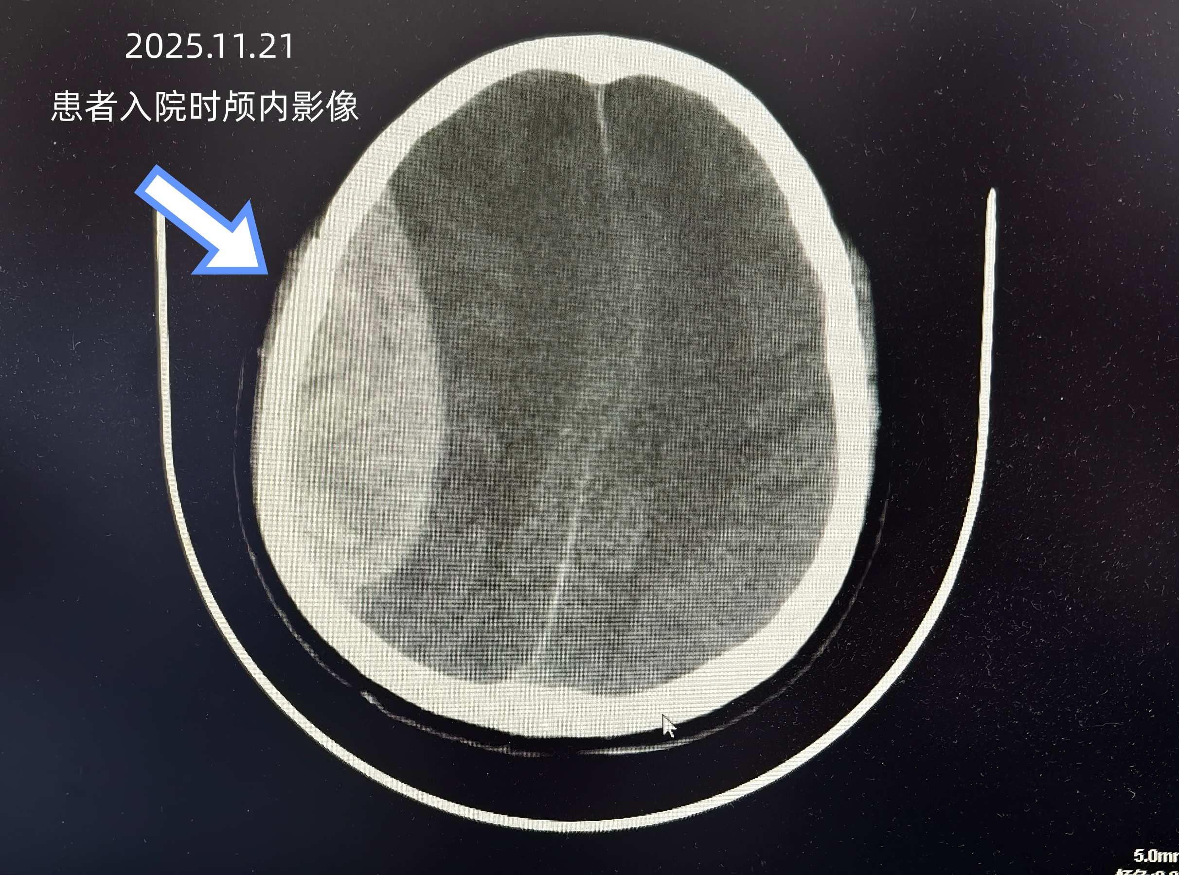 11月21日,叶某被3米高树枝砸伤头部昏迷入院。医院迅速开启绿色通道,影像检查提示患者右侧额颞顶硬膜外多发血肿伴颅骨骨折,需立即手术抢救。在麻醉科、手术室团队的紧密配合下,神经外科团队其施行了“右侧额颞顶开颅硬膜外多发血肿清除术+骨瓣还纳术”,清除了右侧颅内血肿并复位骨瓣。手术操作顺利,但在返回重症监护病房(ICU)后,患者并未出现预期的意识复苏迹象,这一异常细节引起了重症医学科与神经外科团队的高度警觉。