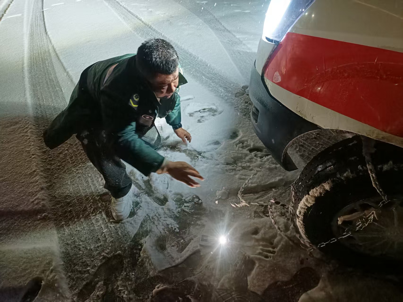 在手电筒的照射下,他们跪在冰冷的雪地里,钻进车辆下,徒手抓起冰冷的防滑链,围着轮胎一寸寸扣紧、固定。冻僵的手指不听使唤,呼出的热气瞬间凝成白霜,但动作却依然稳定。很快,防滑链安装完毕。救护车稳稳驶过陡坡,最终安全抵达现场,顺利接到了患者,并将其安全送回医院,为后续的抢救赢得了宝贵时间。