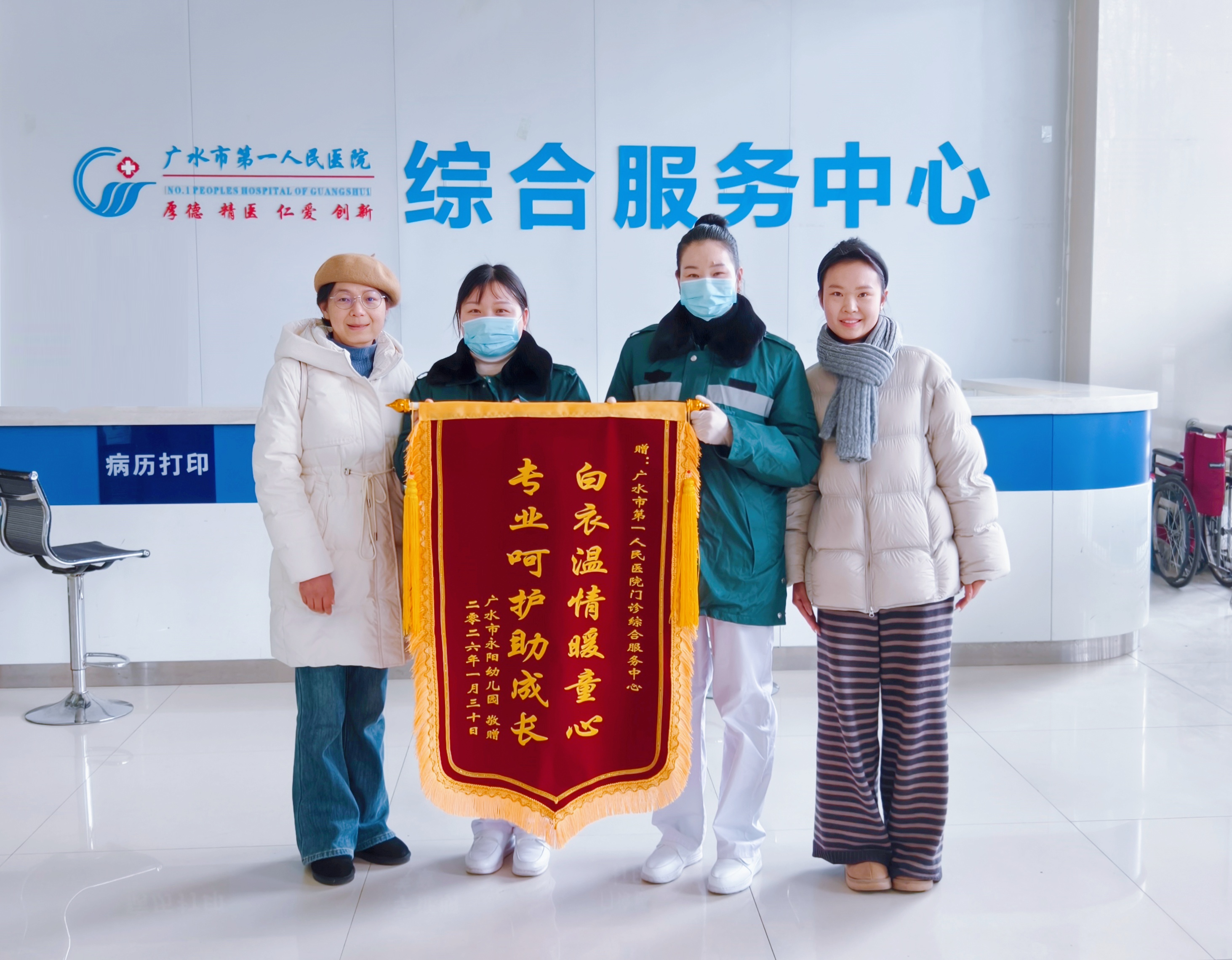 1月29日,广水市永阳幼儿园园长黄琼一行来到广水市第一人民医院,将一面写有“白衣温情暖童心,专业呵护助成长”字样的锦旗送至医院门诊办工作人员手中,以此表达对医院长期以来在儿童健康保障方面倾力付出与真诚关怀的衷心感谢。