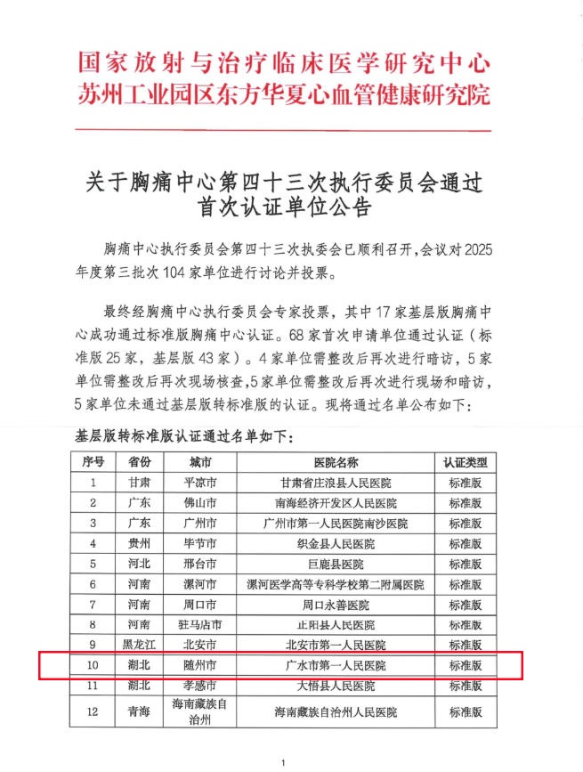 2月4日,国家放射与治疗临床医学研究中心与苏州工业园区东方华夏心血管健康研究院联合公布了胸痛中心第四十三次执委会认证结果,广水市第一人民医院胸痛中心顺利通过评审,成功由“基层版”升级为“标准版胸痛中心”,标志着该院胸痛中心建设迈入更高质量、更规范化的新阶段。
