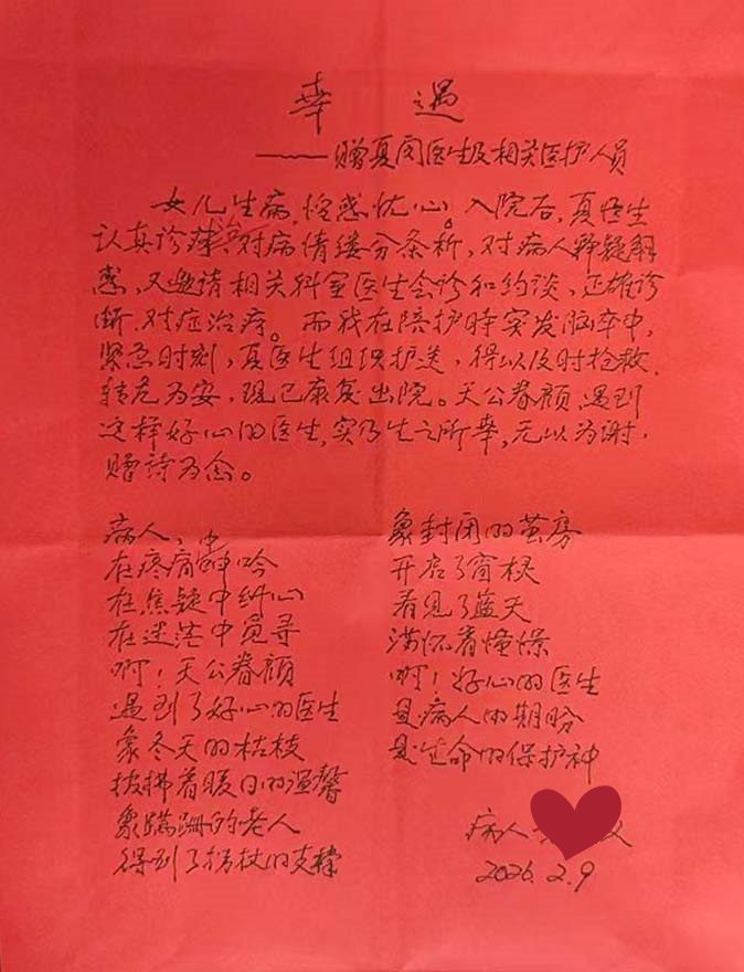 “天公眷顾,遇到这样好的医生,实乃生之所幸。”刘先生在感谢信中深情写道。随信附上的小诗中,【好心的医生,是生命的保护神】一句,道出了自己一家人由衷的感激。